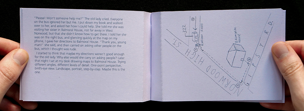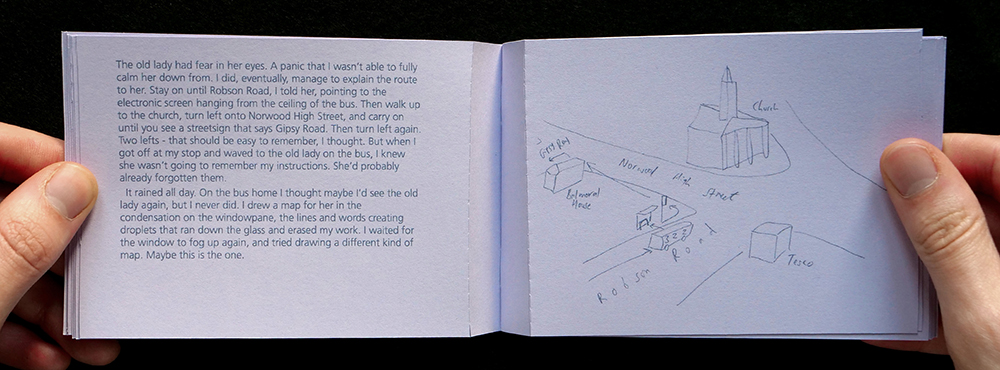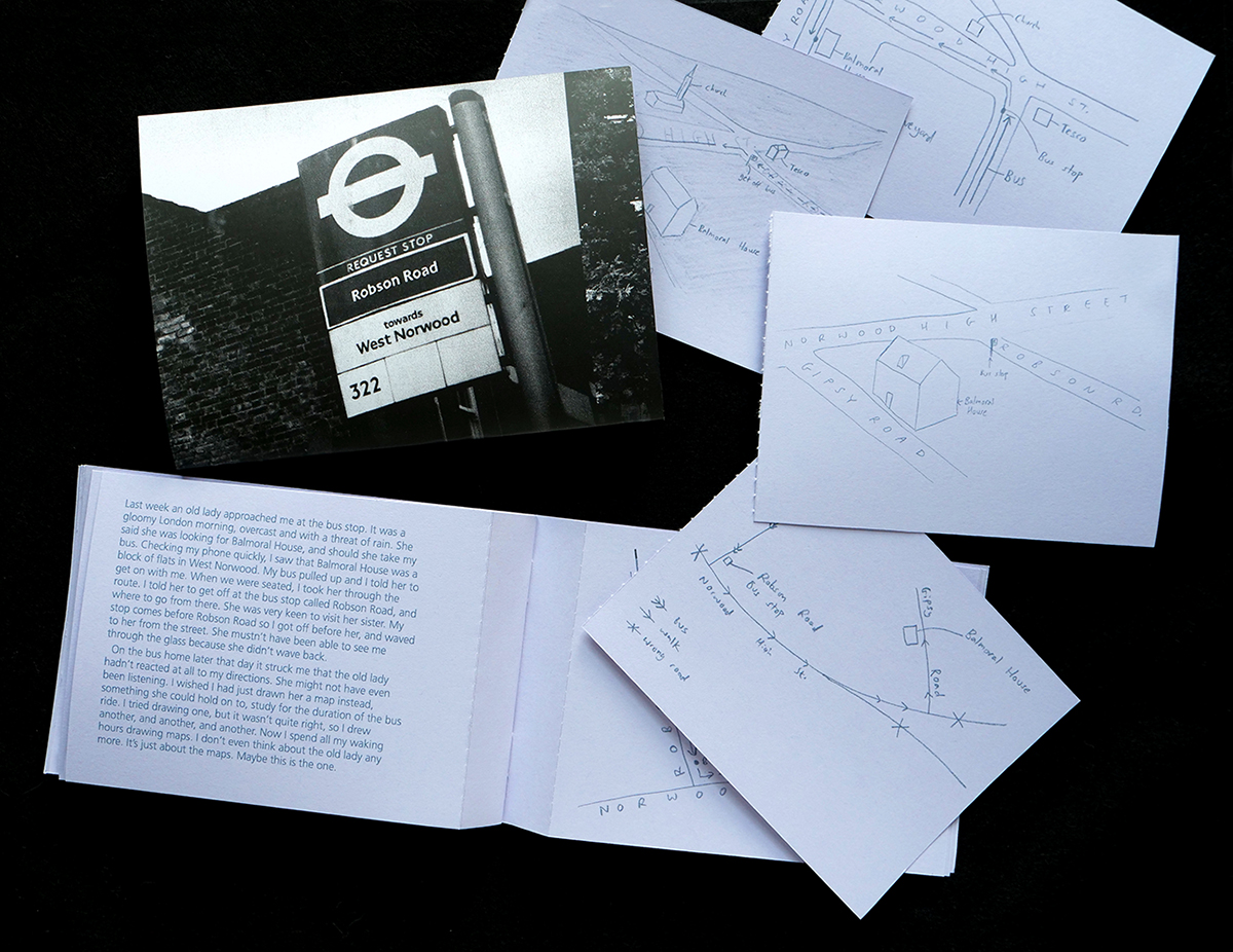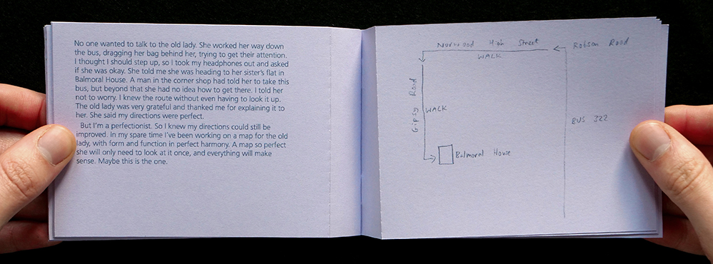 Then I wrote the story of the old lady on the bus, again and again, trying different angles and different formats, but none of them were quite right. I collated the 16 maps and 16 stories into a booklet, with perforated pages so they can be individually distributed. The true story of what happened that morning is scattered between all the stories, just like the perfect map is scattered between all the maps. None of the stories are totally true, and none of the maps are totally efficient, but when I see the old lady again I’ll ask her which one she prefers.