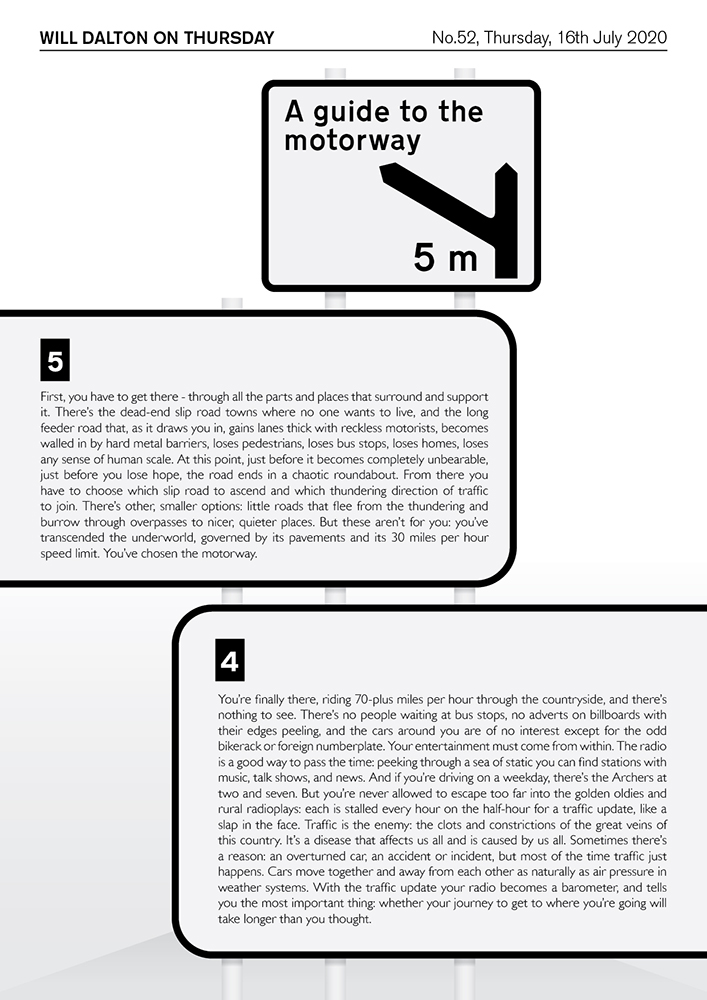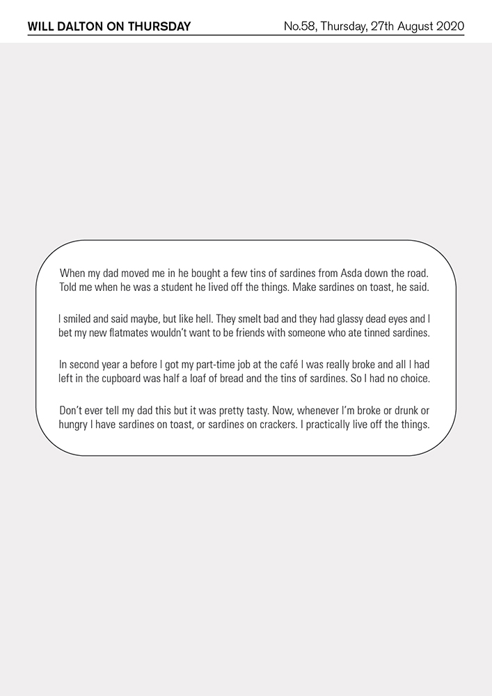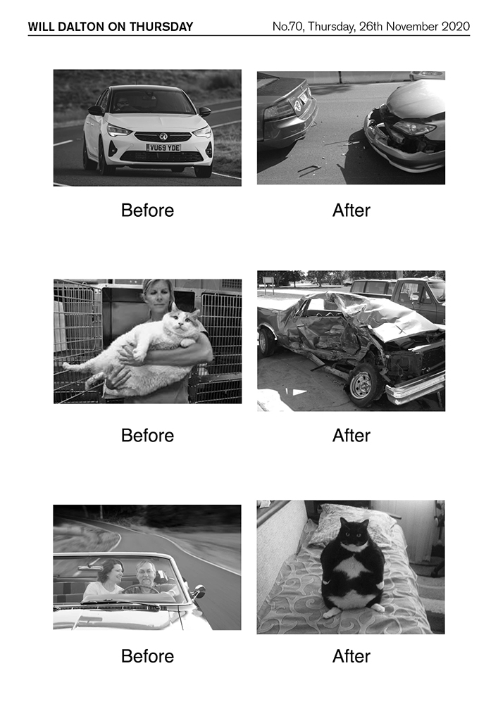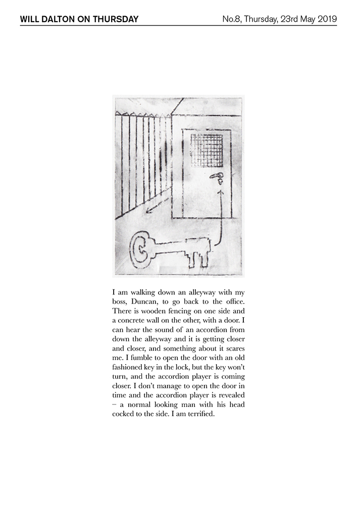 Between 2019 and 2021 I published a weekly newsletter every Thursday, appropriately called Will Dalton on Thursday. A reimagining of the newsletters I used to distribute among my friends when I was a child, I wanted a time-dependent format that would encourage me to create new work, or be a place to document ongoing projects. The brief was simple: there had to be writing on the front and images on the back.