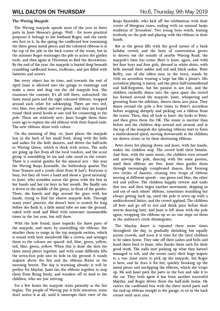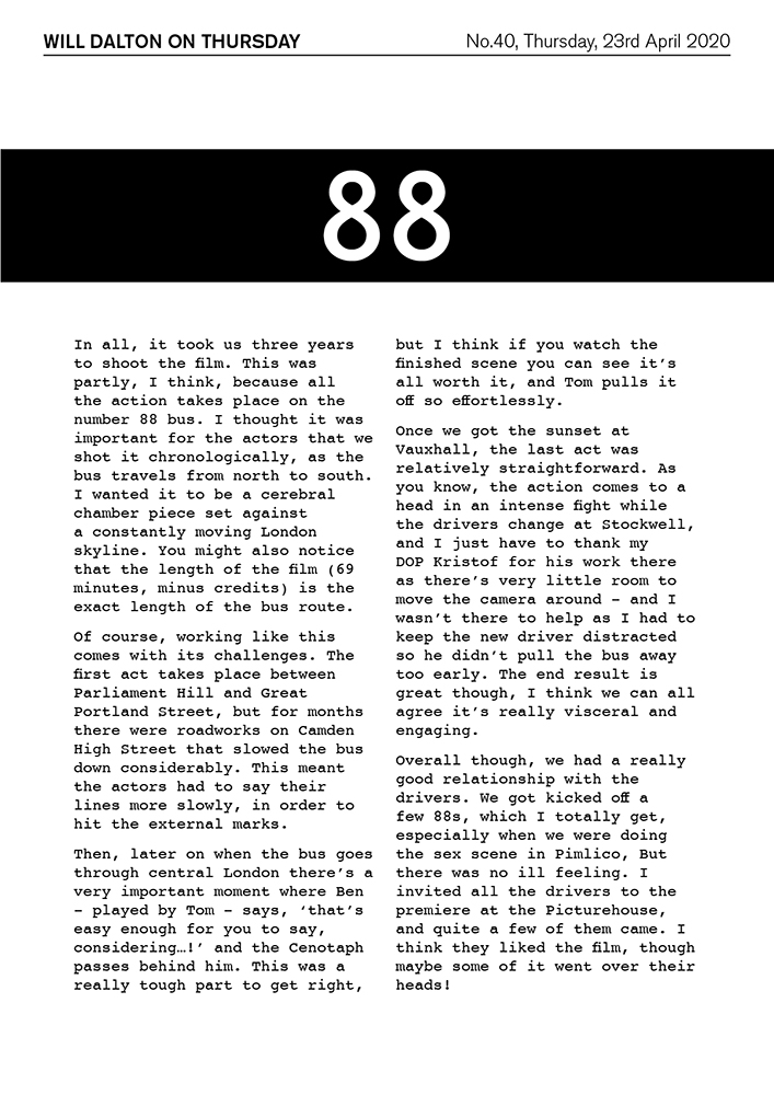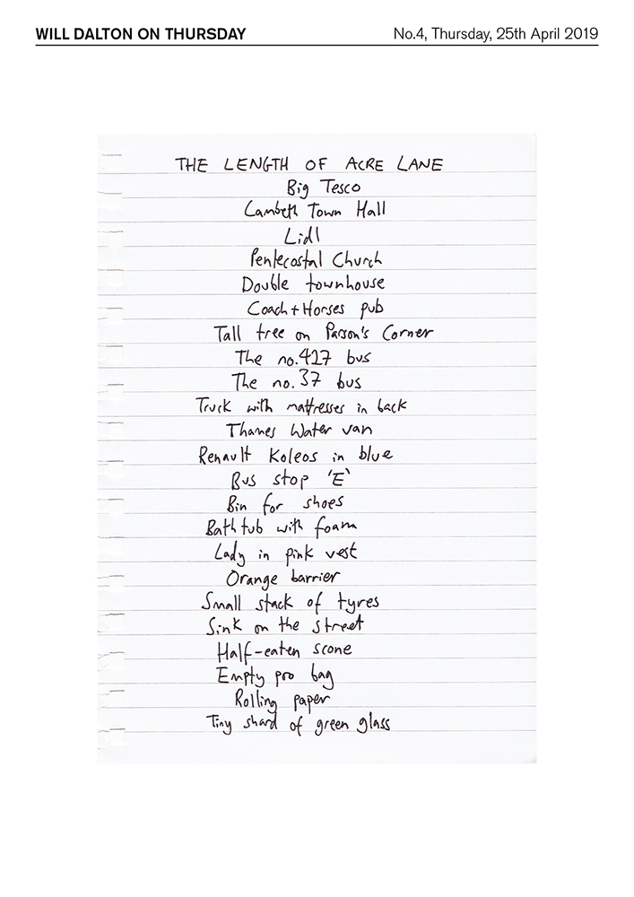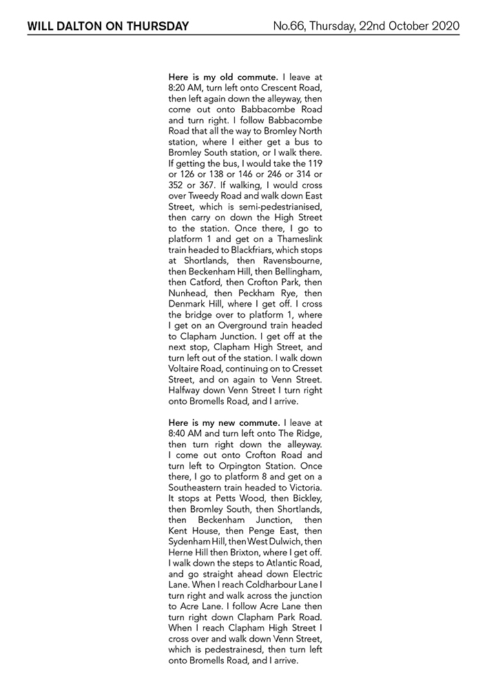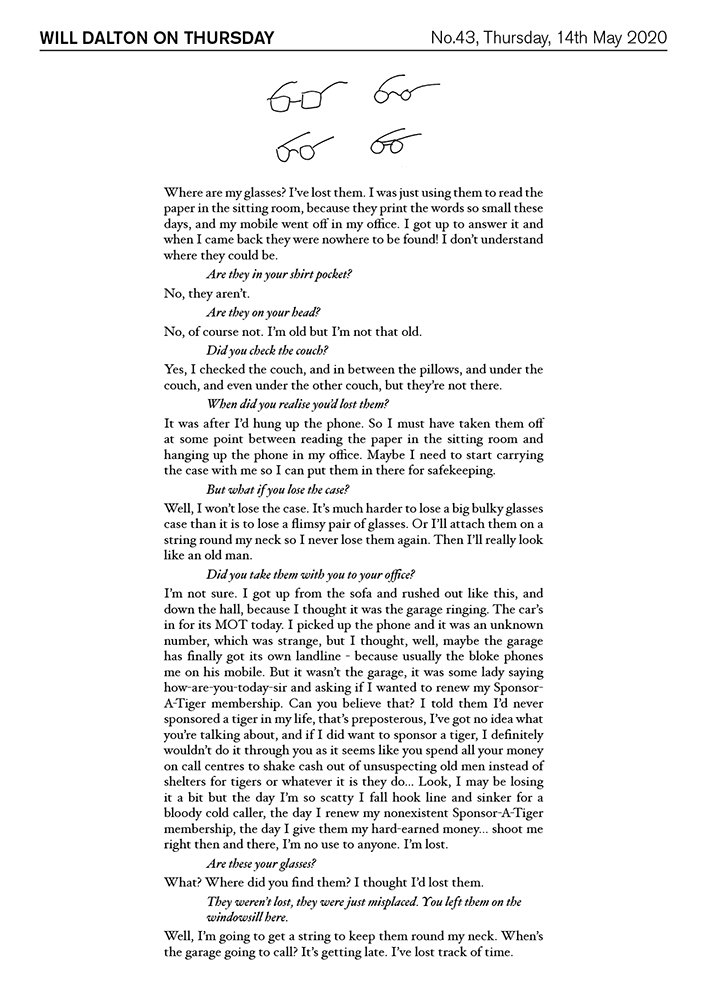 Between 2019 and 2021 I published a weekly newsletter every Thursday, appropriately called Will Dalton on Thursday. A reimagining of the newsletters I used to distribute among my friends when I was a child, I wanted a time-dependent format that would encourage me to create new work, or be a place to document ongoing projects. The brief was simple: there had to be writing on the front and images on the back.