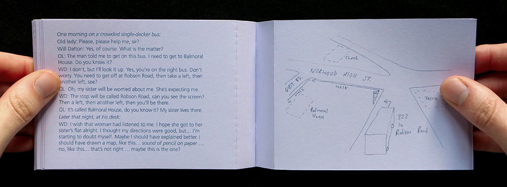 Then I wrote the story of the old lady on the bus, again and again, trying different angles and different formats, but none of them were quite right. I collated the 16 maps and 16 stories into a booklet, with perforated pages so they can be individually distributed. The true story of what happened that morning is scattered between all the stories, just like the perfect map is scattered between all the maps. None of the stories are totally true, and none of the maps are totally efficient, but when I see the old lady again I’ll ask her which one she prefers.