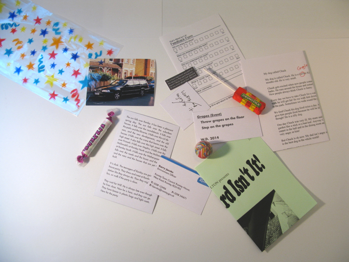 Mounted photographs lined the corridor outside, and inside, the fridge was covered with fake childrens' drawings, there were Romley council posters on the noticeboard, and a projector showed a selection of videos. A curated playlist of old pop songs was playing, and guests were given WKDs to remind them of old school house parties. Towards the end of the evening, I gave a speech and performed two songs - 'Betsy' and 'What Is Love'. Guests went home with a party bag, which contained several pieces of printed matter, sweets and a piece of painted pasta. Everyone had a good time.