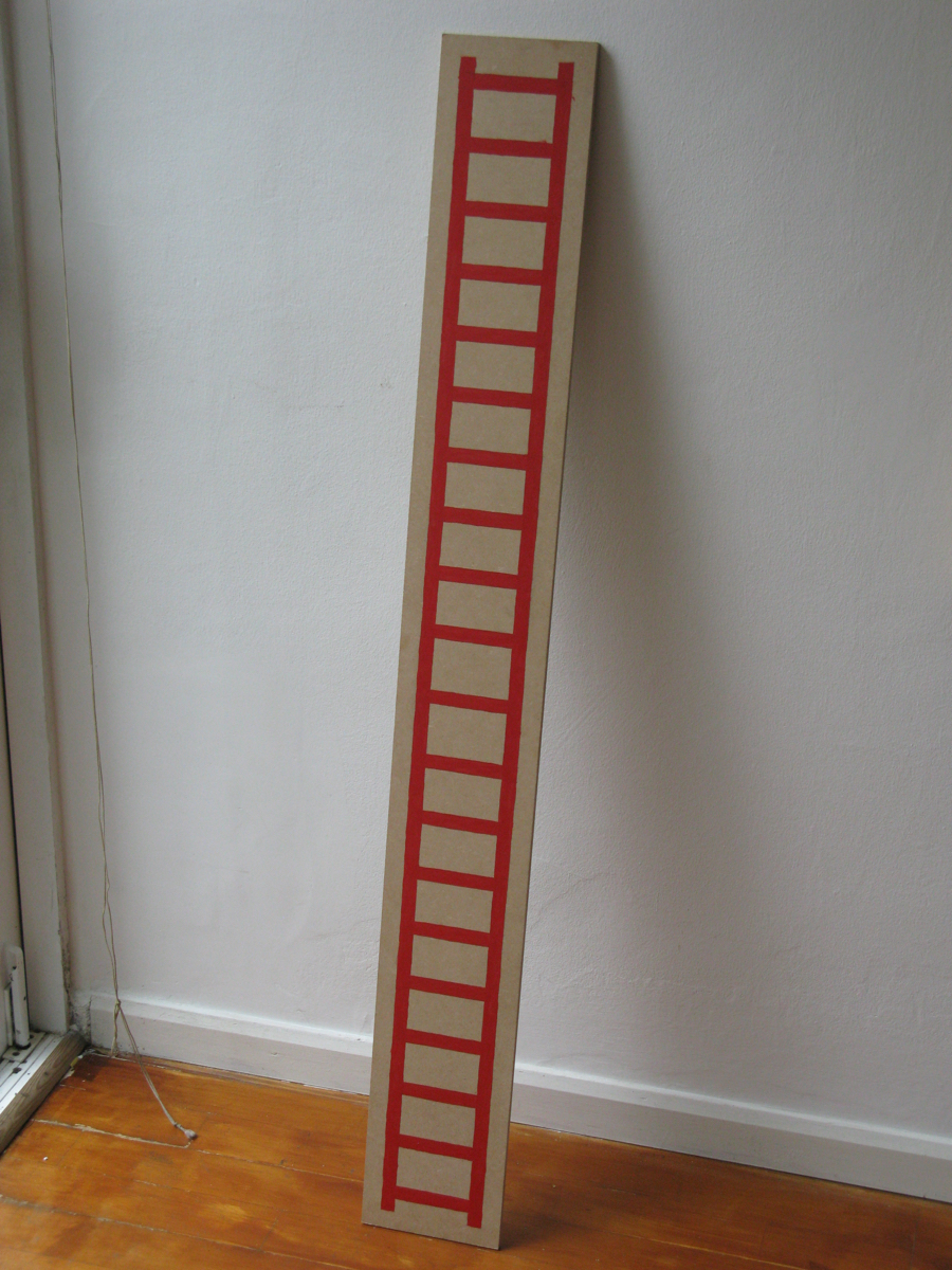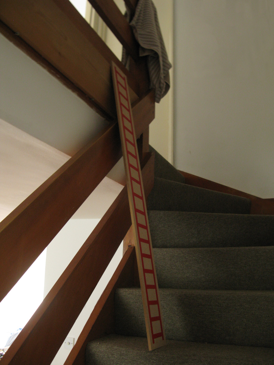 The ladder is a simple graphic icon that everyone can understand. Like an arrow, it implies movement, usually upwards. A ladder unites what is at its bottom and what is at its top, and creates the opportunity of travel from one to another, along a series of rungs. A ladder can unite any two levels if it is long enough. I made a painting of a ladder that had all the potential of a real ladder but was impossible to use.