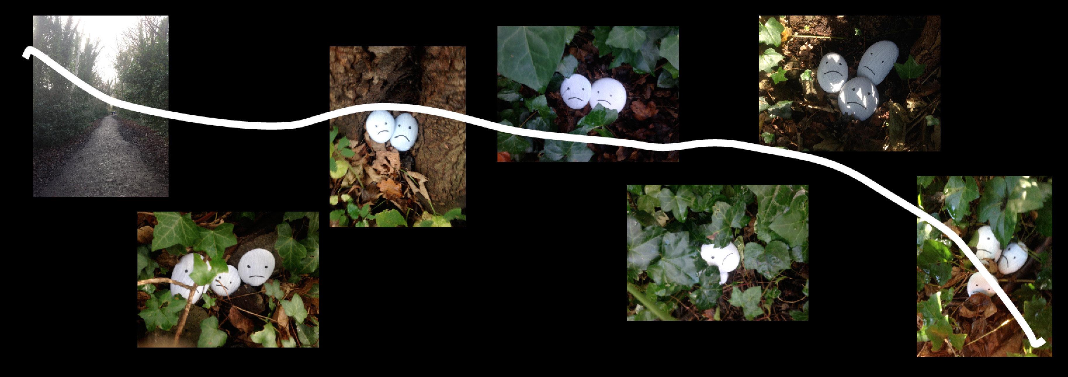 Something then came together. I painted the rocks white, added unhappy faces, and distributed them along the forest path. I hid them behind trees on the sides of the path, in clusters. Like shrines, or little families of two, three or four pitiful rocks.